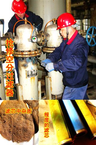 他們中間既有“技能大師”、市級(jí)“五一勞動(dòng)獎(jiǎng)?wù)?rdquo;獲得者設(shè)備“醫(yī)學(xué)專(zhuān)家”—伏彩兵,也有不見(jiàn)經(jīng)傳的普通一線(xiàn)維修員工。近期,公用工程部人員發(fā)現(xiàn)1#空分制氮機(jī)組氣壓降低1個(gè)表壓,能耗上升,氮?dú)饧兌群彤a(chǎn)氣量雙降,有報(bào)警停車(chē)隱患,經(jīng)維修和自主維修“醫(yī)生”緊急會(huì)診,診斷為“芯梗”,需要立即“換芯”(更換空氣過(guò)濾器濾芯),面對(duì)突發(fā)情況,為保證生產(chǎn)安全運(yùn)行,維修人員自覺(jué)加快維修進(jìn)度,加班加點(diǎn)開(kāi)展濾筒解體,吊裝,換芯,復(fù)位等工作,提前兩小時(shí)完成搶修任務(wù),原“芯梗”制氮機(jī)組進(jìn)氣運(yùn)行后壓力恢復(fù)正常,隱患解除。