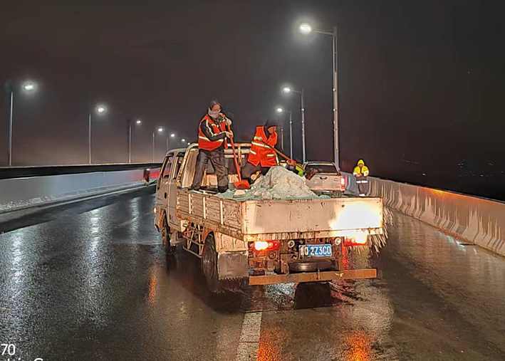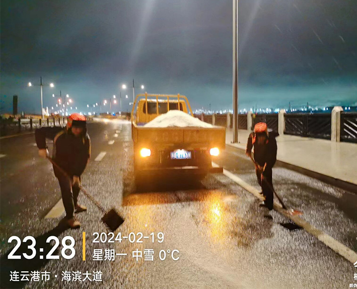 該公司迅速啟動突發(fā)天氣應(yīng)急保障預(yù)案,近30余名道路應(yīng)急排險突擊隊員,在公司統(tǒng)一按排下 ,裝車備運融雪鹽斤近15噸,現(xiàn)場工作中隊員們士氣高漲,無所畏懼。夜間8時左右,10余名黨員先鋒,兵分三路再次安全有序奔赴燒香河、海濱大道、228等路段橋梁,無懼大風(fēng)夾著冰雨顆粒吹打臉頰,兩人一對、三人一組、揮動手中鐵銑,汗水與冰雨濕透橙色衣衫,經(jīng)過近4個多小時努力奮戰(zhàn),人工撒放融雪鹽斤近20余噸,高質(zhì)高效保障近30座橋梁安全通暢。