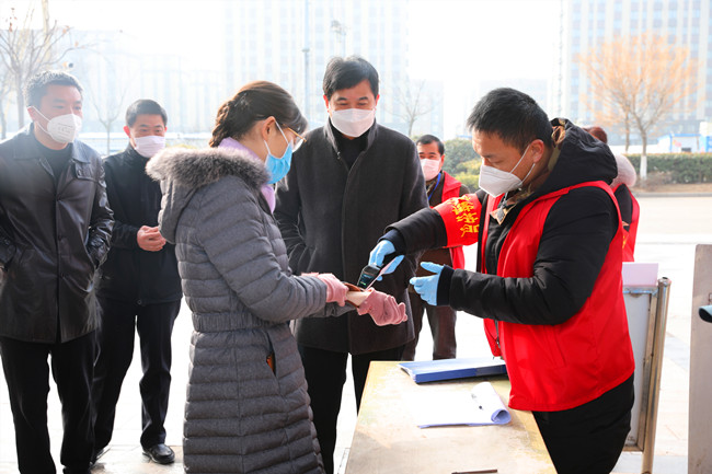 汪書記一行在公司疫情防控檢查站前,詳細了解了公司疫情防控情況,青農(nóng)一路作為主要的進場通道,四個單位的黨員干部輪流值班,并設(shè)置臨時看護房,保證二十四小時值班。在鹽場家園小區(qū)僅保留一個出口,外來家用轎車一律禁止入內(nèi),每戶發(fā)一張通行證,嚴(yán)格管控人員流動。汪書記得知物業(yè)公司還沒有完成,鼓勵大家非常時期用非常辦法,將工作做細做實,想居民所想,嚴(yán)格做好防控工作。進入小區(qū)前,汪書記也與居民一樣配合登記和測量體溫,當(dāng)看物業(yè)為了保證每天定時對單元和電梯間等重要場所的消毒存有大量消毒液,強調(diào)物業(yè)公司要增強消毒物品存放安全意識,合理使用,盡最大努力保一方平安。